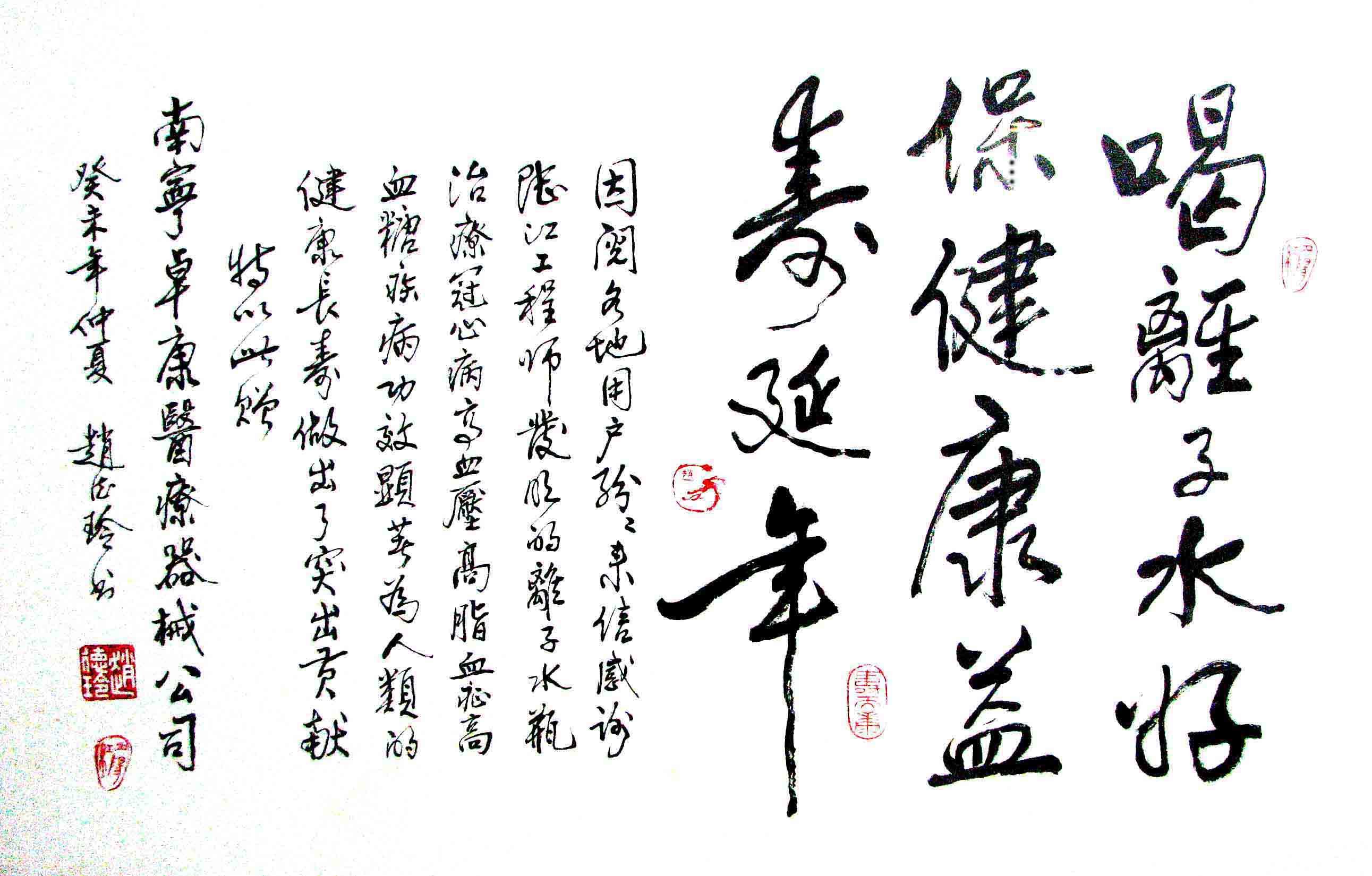 - -- 幾千年來,人類靠醫(yī)藥不能根治冠心病、高血壓和糖尿病,如想根治,那是夢想。可是,我從中國基礎(chǔ)醫(yī)學(xué)研究成果受到啟發(fā),研發(fā)了一種發(fā)明產(chǎn)品,處理出微小分子團(tuán)水讓人飲用,實現(xiàn)了人類這一夢想!患者飲用后遠(yuǎn)離了冠心病、高血壓和2型糖尿病。這一成果曾經(jīng)過臨床試用和專家鑒定,作為準(zhǔn)字號醫(yī)療器械讓廣大患者飲用,療效進(jìn)行跟蹤調(diào)查。很多患者的反饋情況令人感動,我放在公司網(wǎng)站上(nnzk.com),震撼了醫(yī)學(xué)專家,也使廣大同胞受到啟發(fā)。人們盼望飲用它給細(xì)胞補水,治愈多種病癥,既省錢,又安全,而且延長壽命。
