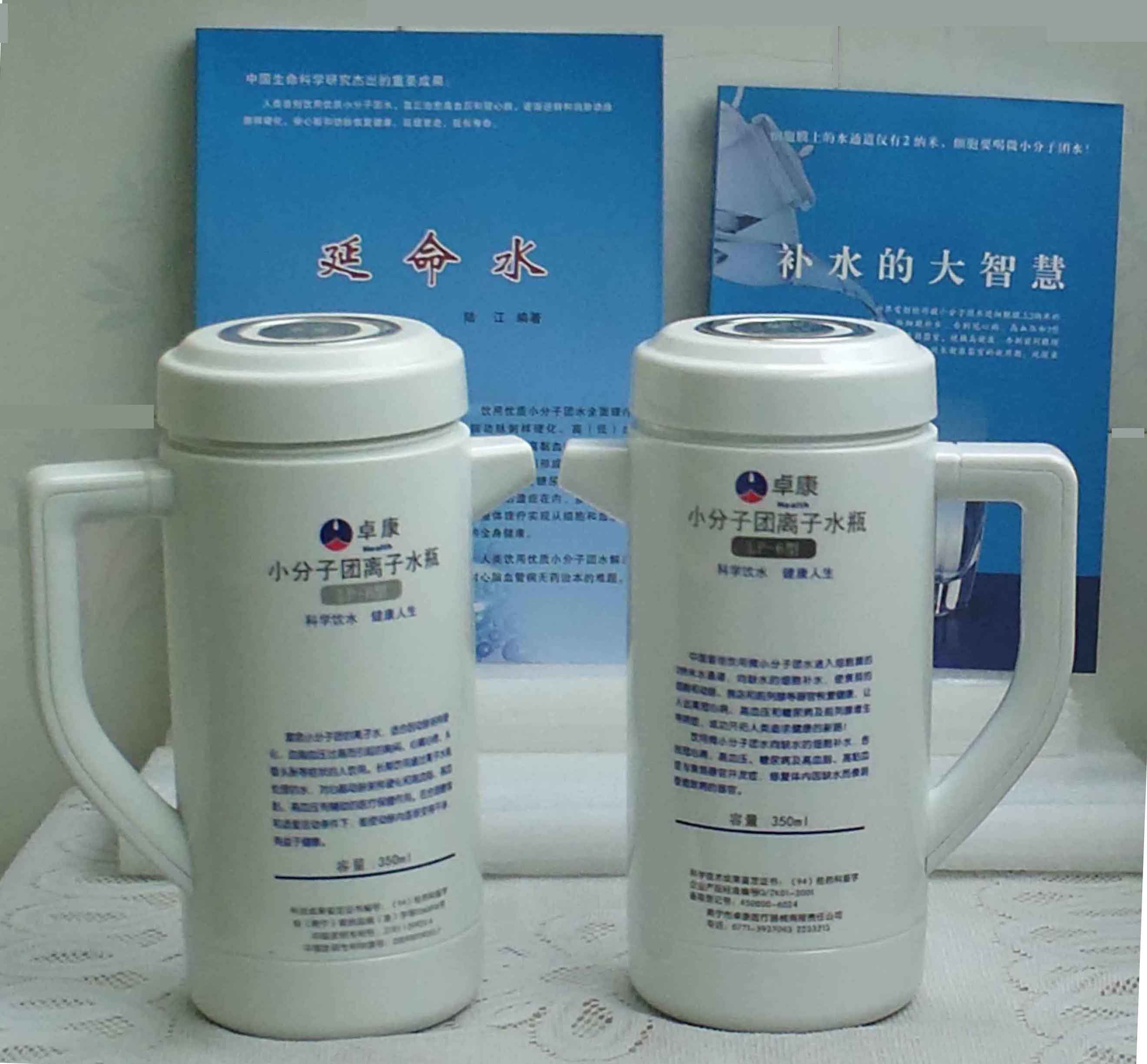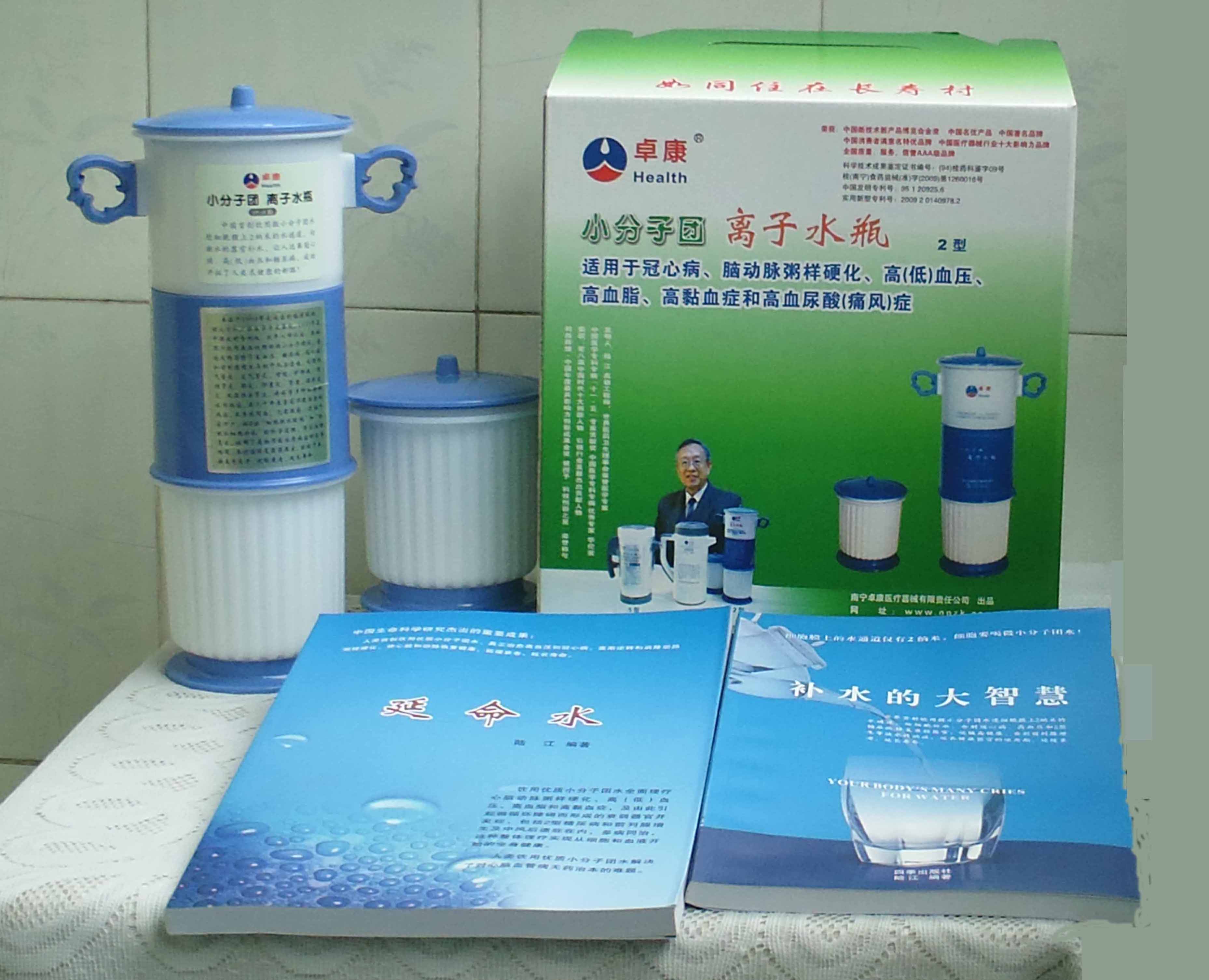 本品大量用戶的使用效果表明,能治愈冠心病、腦動脈硬化、原發(fā)性高(低)血壓、高血脂、高粘血癥、高血尿酸癥(痛風(fēng))和2型糖尿病、衰弱器官并發(fā)癥(前列腺增生、腎衰與尿毒癥)及中風(fēng)后遺癥等療效好。產(chǎn)品配信譽卡。使用壽命30年,不換芯,易清洗。團(tuán)購優(yōu)惠。從郵局匯款,匯費1%,地址按本頁下方地址、聯(lián)系人寫。從銀行匯款,請點擊[聯(lián)系匯款]欄,從工商銀行匯款,建設(shè)銀行、農(nóng)業(yè)銀行匯款,均免收匯費,匯款后20--30分鐘內(nèi)發(fā)短信,可用微信轉(zhuǎn)帳,均免匯費,微信號即手機號13768308380。匯款后,告知你的姓名和地址,我公司聯(lián)系人手機號是:13768308380卓康牌離子水瓶為我公司獨家生產(chǎn),郵購產(chǎn)品配《補水的大智慧》彩印書一本,另配四季出版社出版的新書《補水的大智慧》一本,并配光盤一張(含央視主持人釆訪陸江的對話視頻)。目前市場和"淘寶網(wǎng)"上有人兜售假冒的偽品,望讀者審察辯別真?zhèn)危旒僬哓飧`假冒本公司的各種認(rèn)證、獲獎獎項、專利號和外包裝盒上的中英文字,包括科技成果的鑒定意見等,請讀者注意防偽。如何識別假貨?已經(jīng)買了假貨怎么辦?(請點擊[打假掠影][打假掠影])。