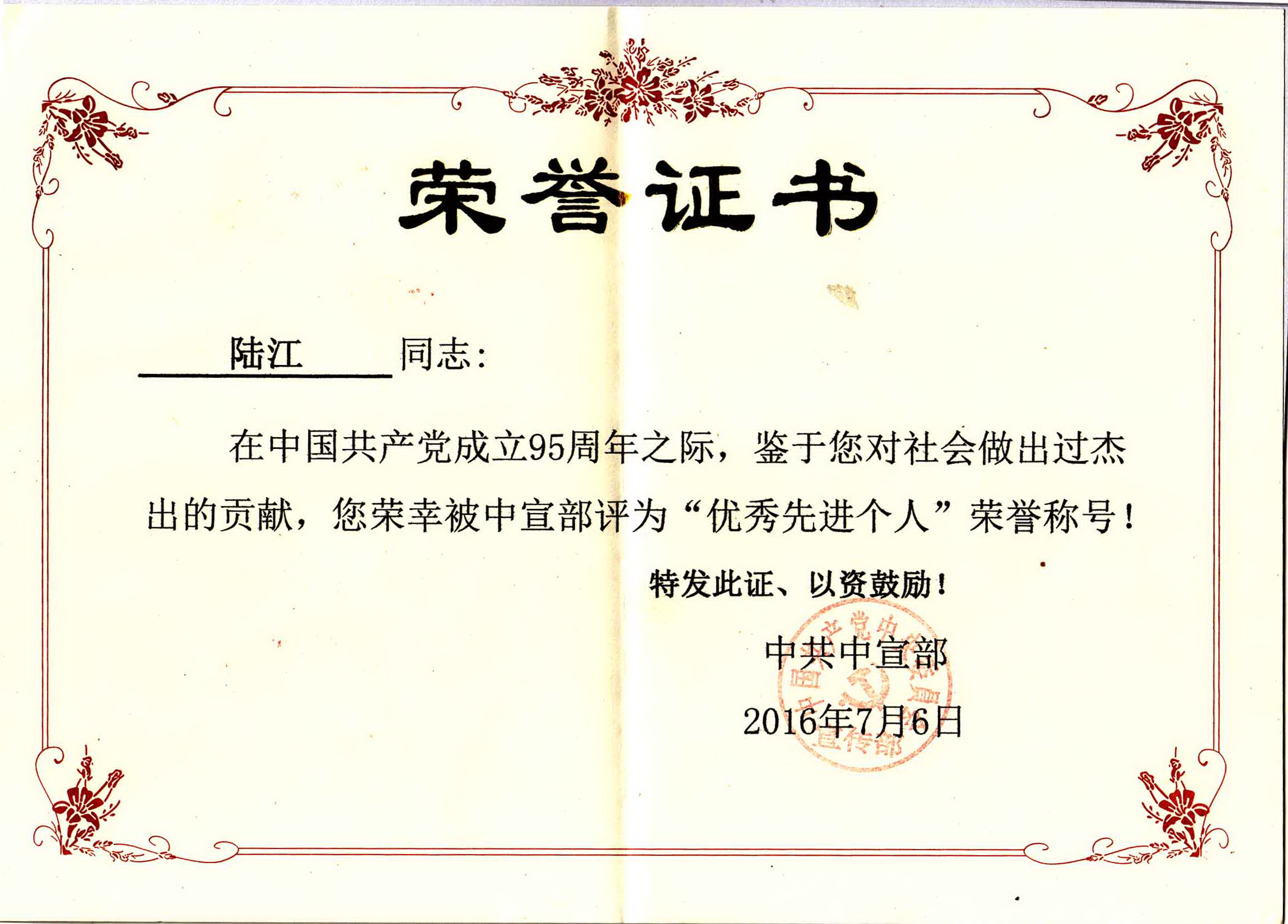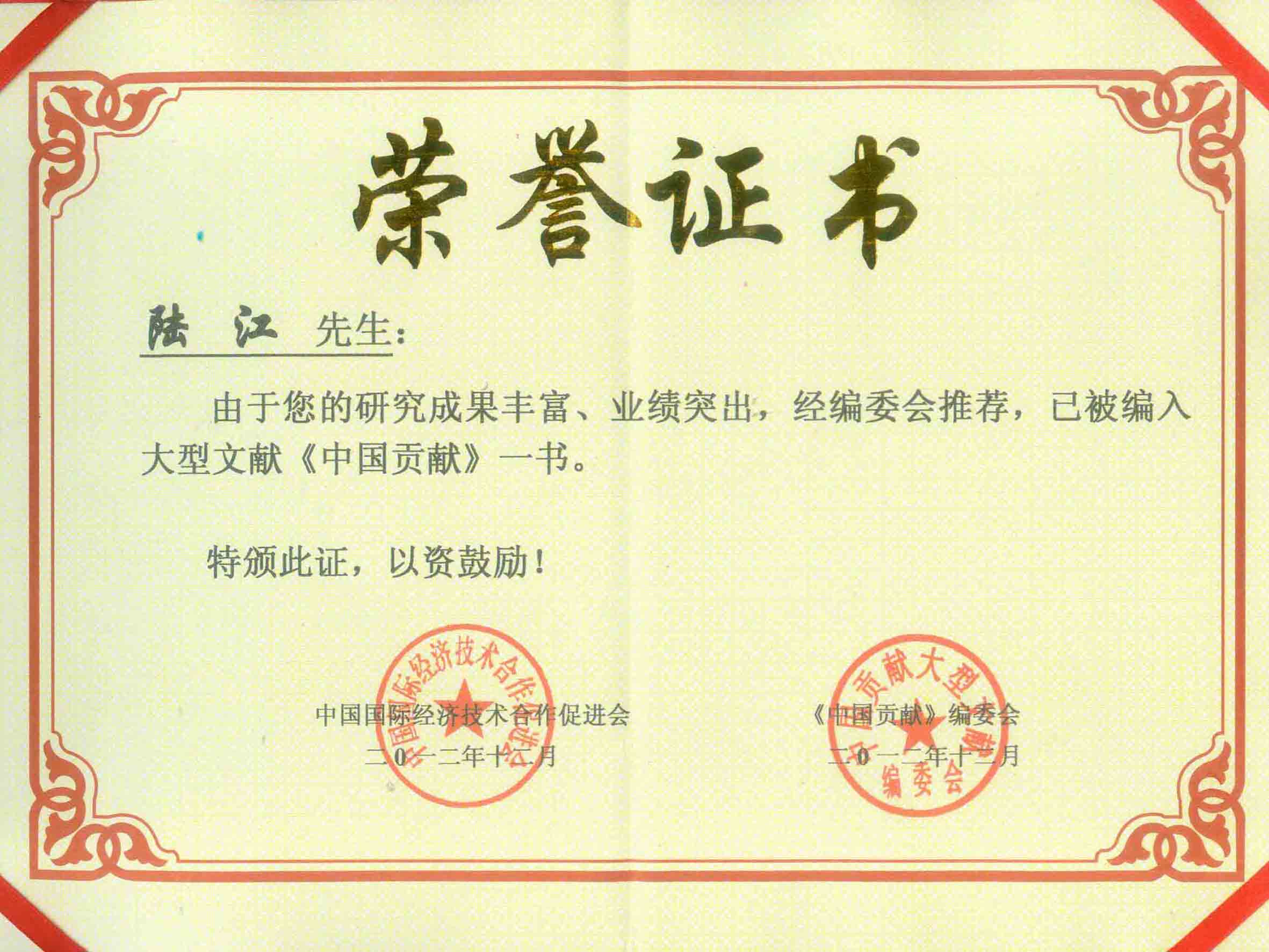 陸江的杰出貢獻(xiàn)被人民日報社評為先進(jìn)個人