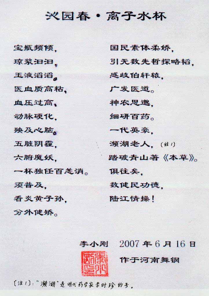 3. 詳細(xì)了解請上網(wǎng),可見臨床報告,鑒定證書、專家評說、治病機理、用戶反饋、題詞、詩歌、錦旗等彩色掃描件,被譽為"神奇水瓶"。