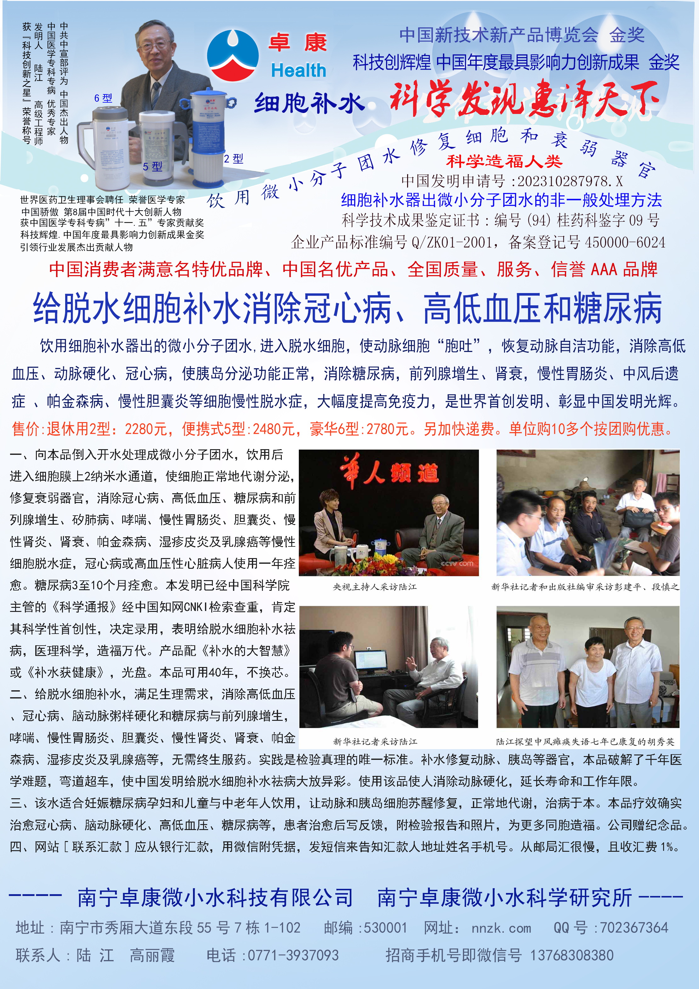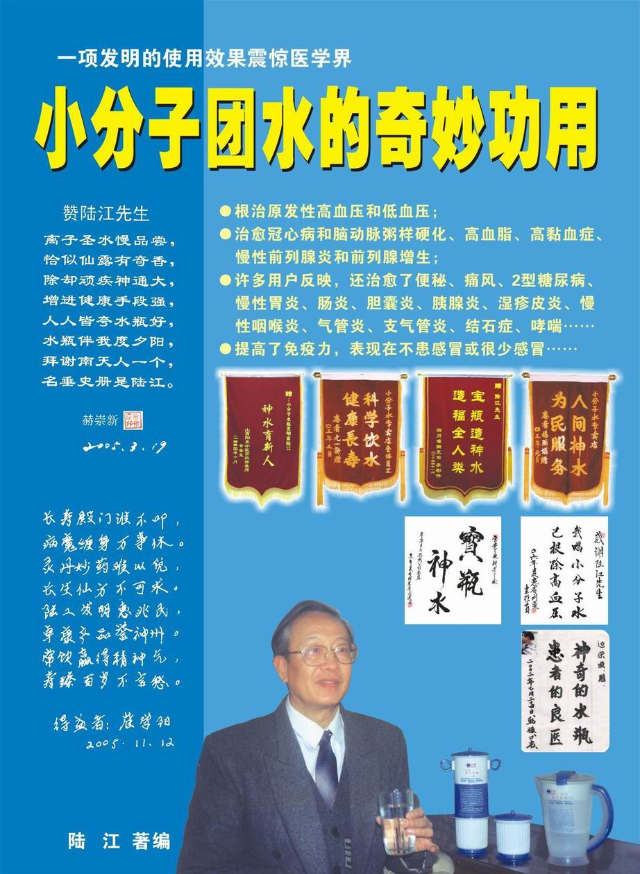 人類幾千年來患以上病癥需終生服藥,幾十年也不能治愈。可是我國南寧的高級工程師陸 江,于1990年想根治高血壓,研究發(fā)明了離子水瓶,處理出微小分子團(tuán)水供飲用,經(jīng)過醫(yī)院臨床試用和專家鑒定,1999年獲中國發(fā)明專利權(quán),產(chǎn)品于2000年投放市場后一直跟蹤調(diào)查,據(jù)全國各地用戶反饋:祛除了高低血壓、糖尿病和冠心病,并使前列腺增生、咽喉炎、鼻竇炎、慢性氣管炎、支氣管炎、矽肺病、哮喘、慢性胃炎、腸炎、慢性膽囊炎、慢性腎炎、腎衰、膀胱炎、便秘、痔瘡、風(fēng)濕性關(guān)節(jié)炎和濕疹皮炎及中風(fēng)后遺癥等病癥不藥而愈。為什么喝微小水能治20多種病?陸 江從1991年德國科學(xué)家發(fā)現(xiàn)細(xì)胞膜水通道僅為2納米獲得啟發(fā),認(rèn)為多種器官患病是因細(xì)胞脫水,不能正常代謝和分裂增殖,才使器官細(xì)胞減少致衰弱萎縮而形成細(xì)胞缺水性病癥。22年來的實踐有力地支持了“細(xì)胞脫水致病”這一重要論點,表明喝微小水可滿足細(xì)胞的生理需求,補水就能祛病,是生命科學(xué)新亮點。