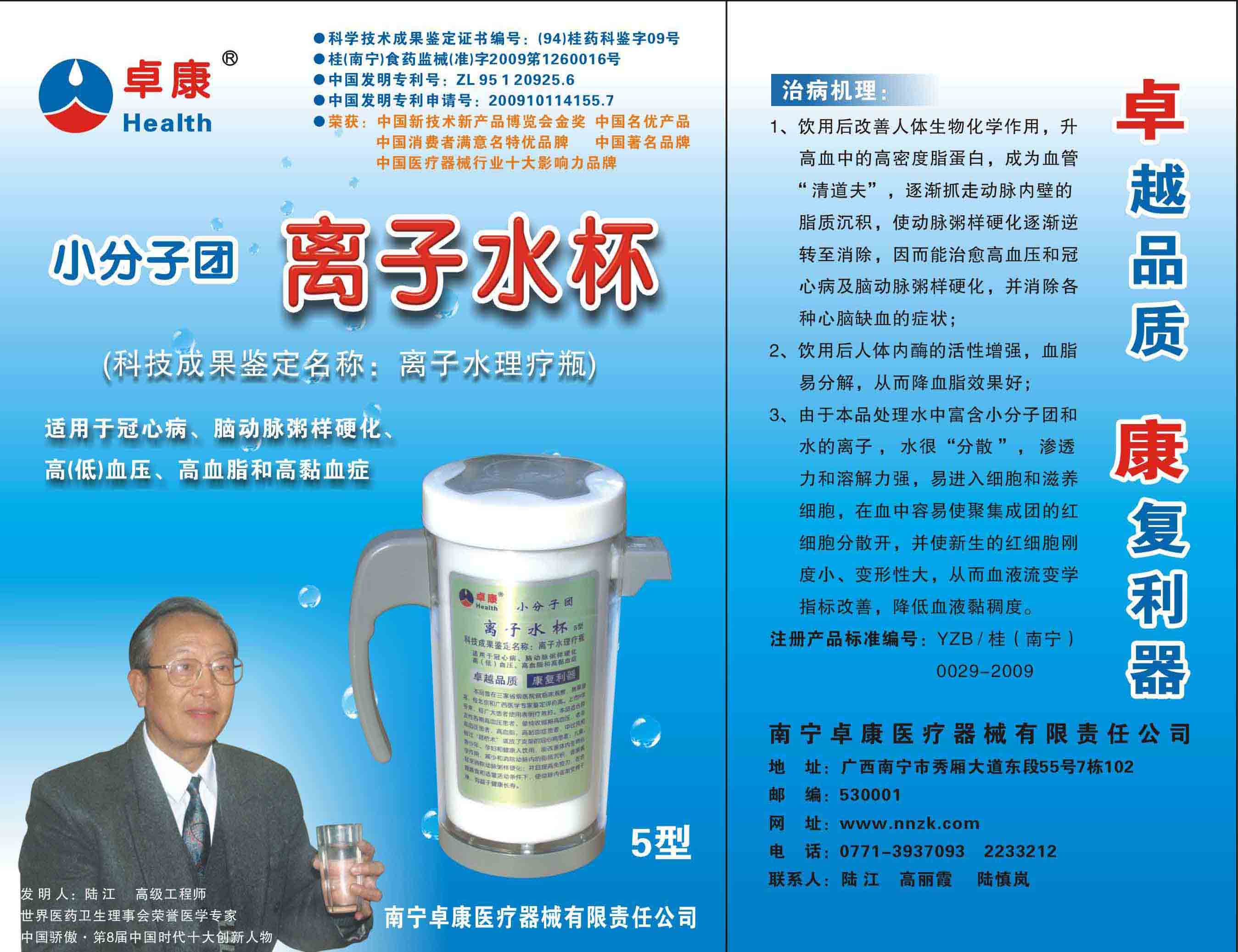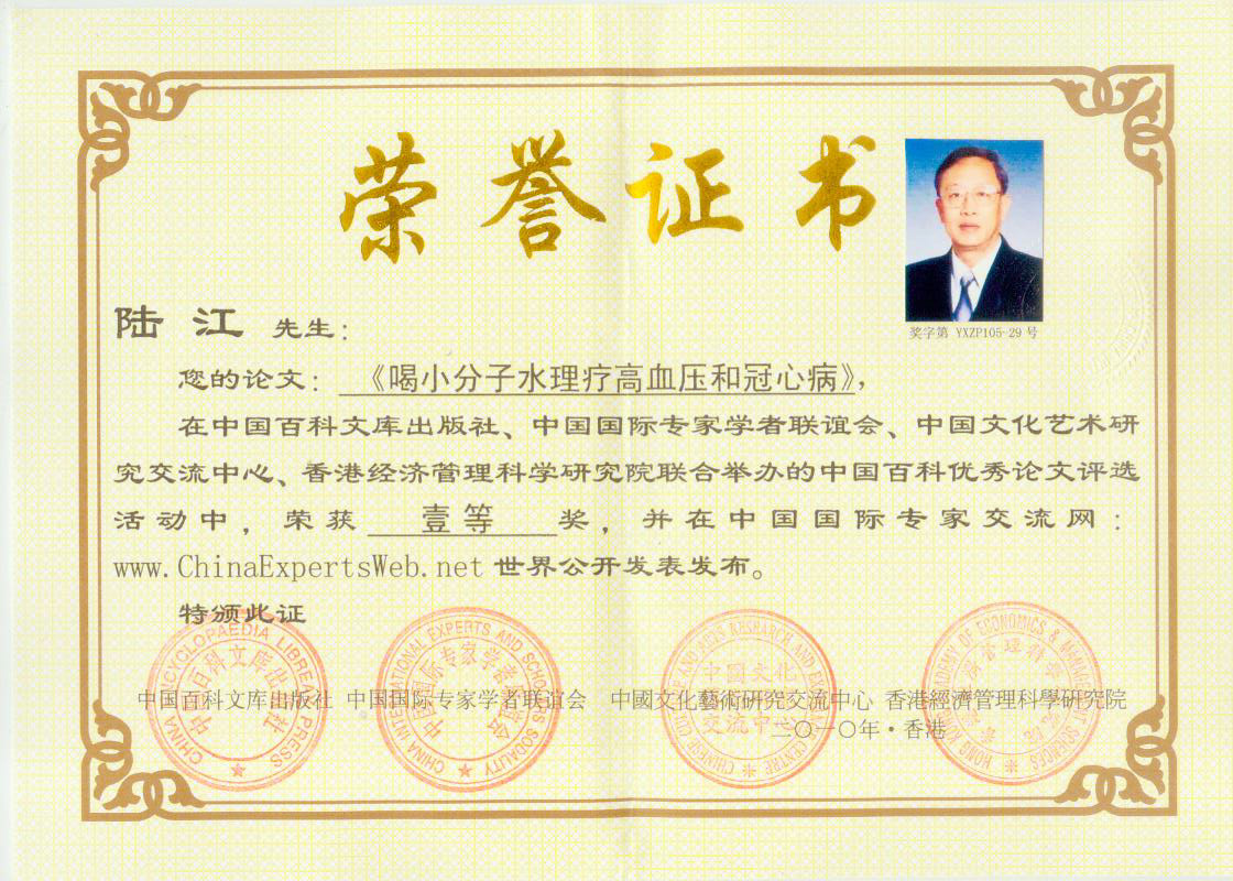 -----我是從事建筑的高工,本來沒有資格去攻克醫(yī)學(xué)難題,卻為了自身健康才扣響醫(yī)學(xué)的大門。由于我1990年患高血壓,因怕中風(fēng)才研究發(fā)明了離子水瓶,我把水處理成微小分子團(tuán)水,飲用后治愈了高血壓。便于1993年底送到三家省級醫(yī)院做臨床試用4個月。經(jīng)北京和廣西醫(yī)學(xué)專家鑒定:"降脂降壓效果好"," 能擴大心腦動脈流量,改善心腦電圖以及微循環(huán)","對治療心腦動脈粥樣硬化、高血壓、高血脂有良好的醫(yī)療保健作用。""產(chǎn)品的技術(shù)性能和療效達(dá)到了同類產(chǎn)品的國內(nèi)領(lǐng)先水平,經(jīng)廣西醫(yī)學(xué)科學(xué)情報研究所檢索,未見國外有類似報道。"中國醫(yī)學(xué)科學(xué)院張正國教授從美國國立醫(yī)學(xué)圖書館數(shù)據(jù)庫存Medline檢索英俄文資料,均未見類似報告。2000年上市后,我為了對消費者負(fù)責(zé)而繼續(xù)觀察研究,一直通過《信譽卡》和《質(zhì)量跟蹤調(diào)查書》向患者承諾療效,請用戶使用6個月后反饋效果。和脂壓患者飲用2至5個月內(nèi),消除癥狀,停服藥物,血壓正常;冠心病患者飲用3~5個月逐漸減輕至消除心絞痛、房顫等癥狀,不再服藥,飲用1年左右心電圖正常,經(jīng)冠脈造影掃描無明顯狹窄,表明冠心病痊愈。大量患者還反映許多衰弱器官被修復(fù),讓前列腺增生、慢性咽喉炎、慢性氣管炎、支氣管炎、慢性胃炎、腸炎和膽囊炎等不藥而愈;2型糖尿病患者是因為胰島衰弱致病,飲用該水半年至一年,逐漸減藥至停藥,血糖尿糖正常,真正治愈2型糖尿病。中風(fēng)后遺癥患者飲用六七個月,可逐漸減輕至消除肢體和語言障礙,表明飲用該水能讓壽命很長的神經(jīng)元細(xì)胞逐漸修復(fù),奇跡般地恢復(fù)肢體和語言功能。飲用后還使胸腺和脾臟兩個重要的免疫器官被修復(fù)和增強,產(chǎn)生免疫細(xì)胞多,提高了免疫力,使人不生病或少生病。自此, 飲用微小分子團(tuán)水創(chuàng)造了攻克冠心病、高(低)血壓和糖尿病三大醫(yī)學(xué)難題的奇跡。人們對此感到不可思議,但實踐是檢驗真理的唯一標(biāo)準(zhǔn)。